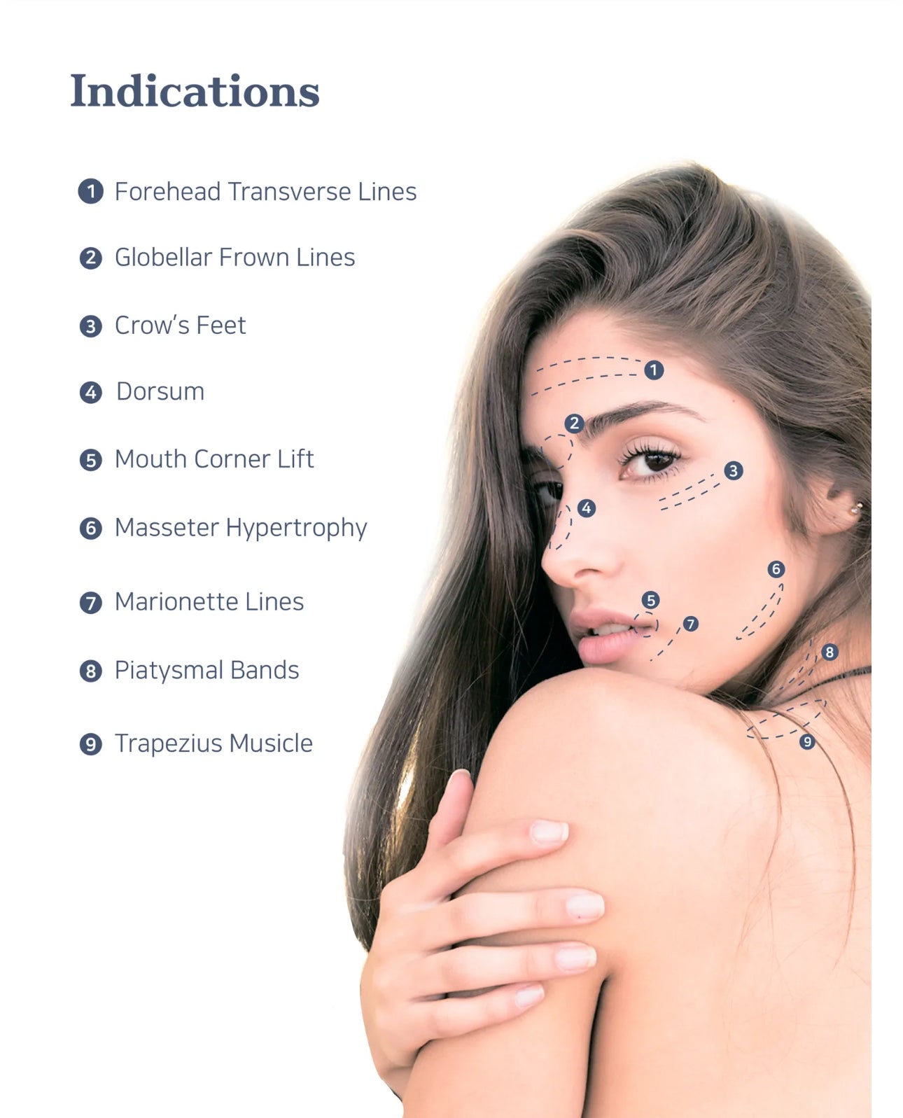 - Effect: Provides temporary improvement of moderate to severe wrinkle lines, such as glabella lines, in adult patients.