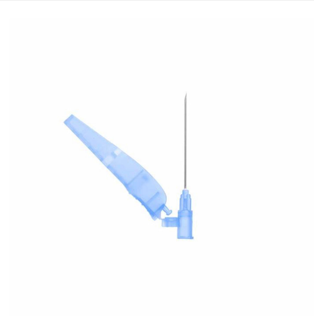 The 23G blue needle is single use sterile needle with a safety mechanism that covers the needle point after use. In the activated position, the needle cover guards against accidental needlestick during normal handling and disposal of the used needle/syringe.